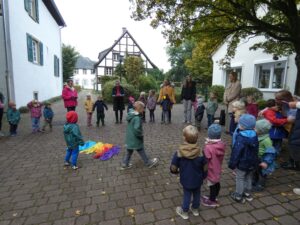 Der Gottesdienst stand ganz im Zeichen der Farben – jede Farbe symbolisierte eine besondere Gabe: Rot für die Liebe, Grün für Wiesen und vieles mehr. Mit Liedern, kleinen Gebeten und Fürbitten haben wir die Bedeutung von Dankbarkeit und Teilen vermittelt.