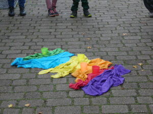 Der Gottesdienst stand ganz im Zeichen der Farben – jede Farbe symbolisierte eine besondere Gabe: Rot für die Liebe, Grün für Wiesen und vieles mehr. Mit Liedern, kleinen Gebeten und Fürbitten haben wir die Bedeutung von Dankbarkeit und Teilen vermittelt.